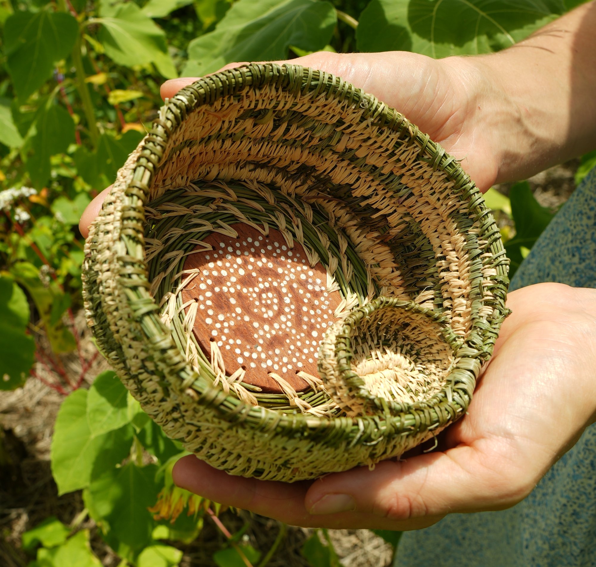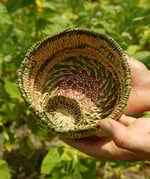 hand made basket from various reeds and grasses, cleaned an prepared, has lovely sweet grass smell and little balcony basket for smaller item storage. Coated in beeswax for firmness and seal. Australia wide shipping :-) sorry cannot ship overseas due to ecological factors